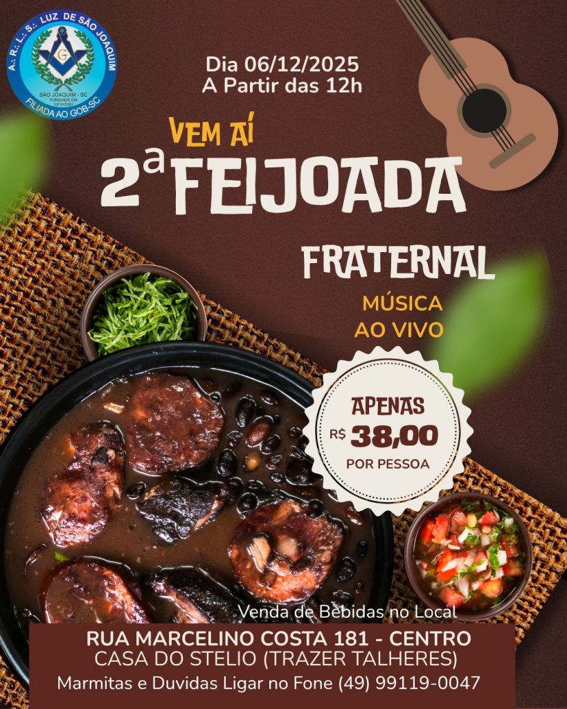 A Maçonaria Luz de São Joaquim promove, no próximo sábado, 6 de dezembro, a 2ª edição da Feijoada Fraternal. O evento começa a partir das 12h e será realizado na Rua Marcelino Costa, nº 181, no Centro — na casa do Stélio.