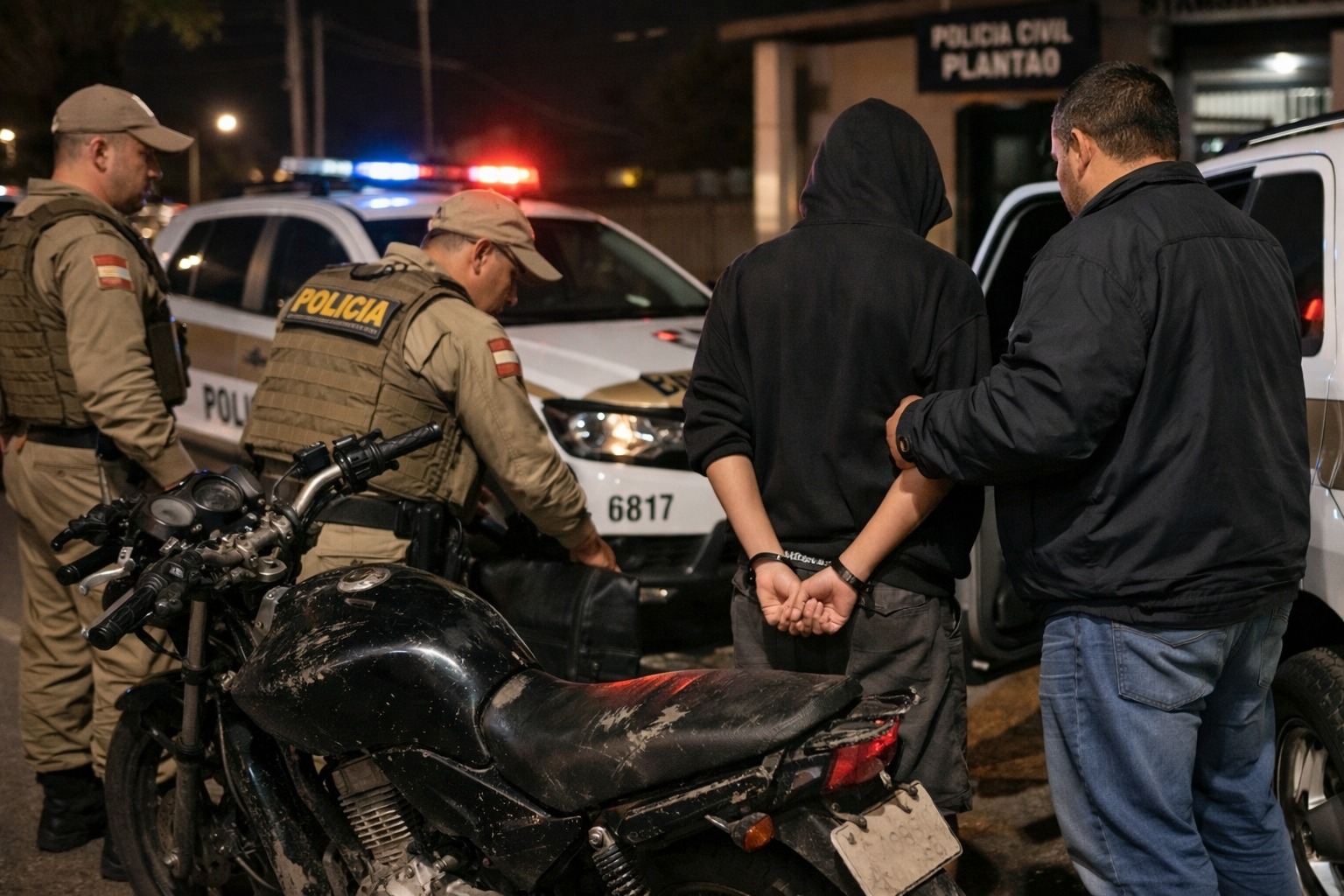 Diante dos fatos, foi lavrado o boletim de ocorrência e o adolescente foi conduzido à Central de Plantão Policial para os procedimentos legais. A motocicleta foi removida ao pátio conveniado.