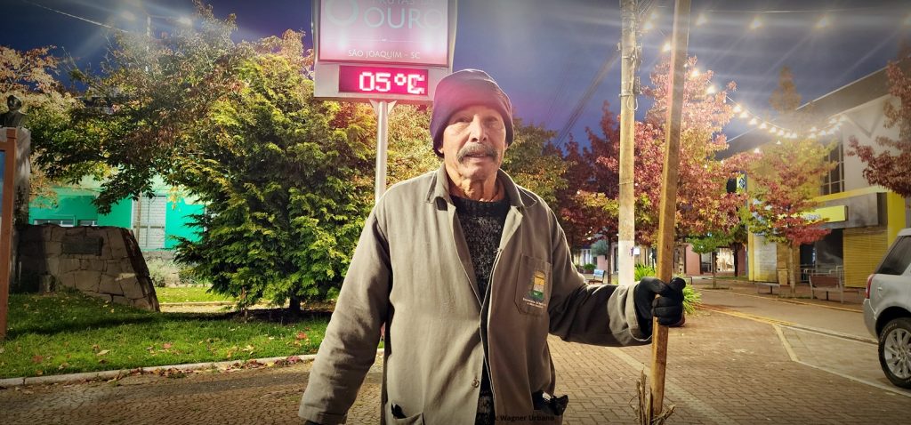 O frio intenso que marca o outono na São Joaquim faz parte da rotina de quem vive na Serra Catarinense. Para o servidor público Aristeu Ramos, de quase 81 anos, as baixas temperaturas nunca foram obstáculo. Há mais de quatro décadas, ele enfrenta as madrugadas geladas para manter limpas as praças da cidade.