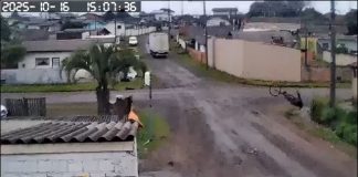 Ciclista fica ferido após caminhão enroscar em fio caído no bairro...