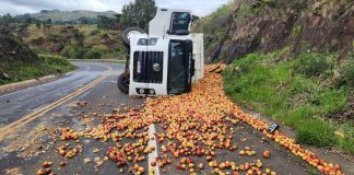 Caminhão carregado de maçãs tomba na SC-114, em São Joaquim