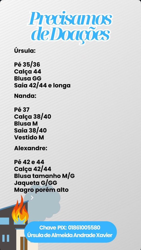 Além de doações em dinheiro, também são bem-vindas roupas, calçados, móveis e utensílios domésticos para ajudar na reconstrução da vida dessa família que perdeu tudo.