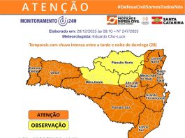 Defesa Civil alerta para risco de temporais em Santa Catarina neste domingo e na segunda-feira