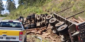 Tombamento de caminhão carregado de toras é registrado na SC-110 em...