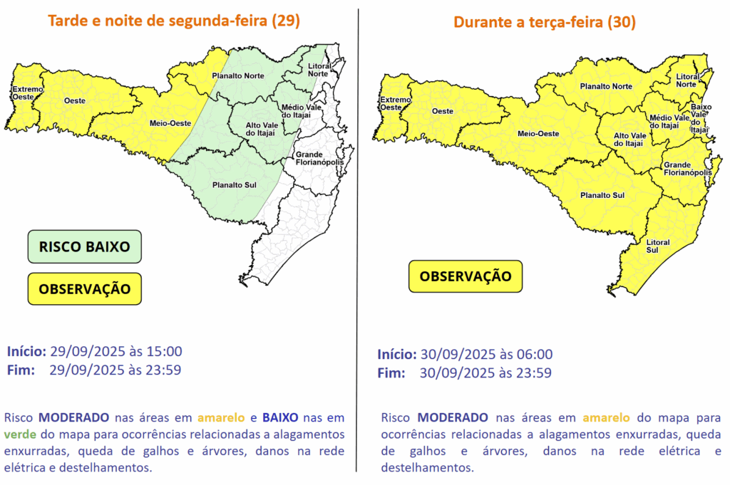 Entre a tarde e a noite da segunda-feira (29) retornam as condições para pancadas de chuva e temporais isolados em Santa Catarina, provocados pelo calor combinado a disponibilidade de umidade e a perturbações em médios níveis da atmosfera. Essa condição tende a ficar restrita ao Grande Oeste e parte do Planalto Norte, começando pelas áreas de divisa com o Paraná e se estendendo para o restante das regiões. O risco é baixo a moderado para ocorrências associadas a destelhamentos, danos na rede elétrica, queda de galhos e árvores e danos na rede elétrica, alagamentos e enxurradas pontuais.