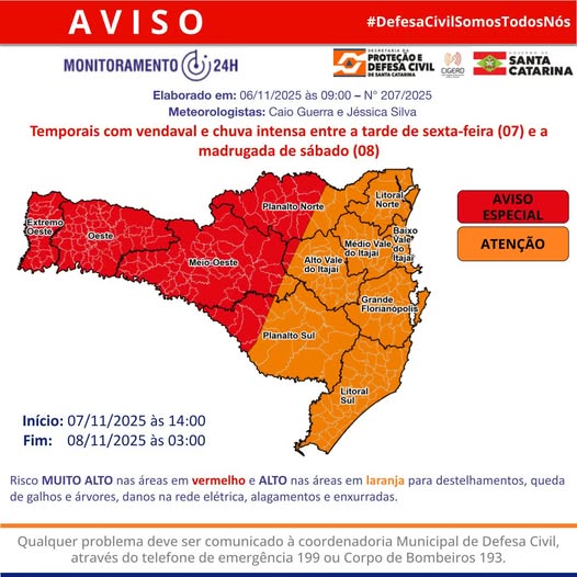 Em Santa Catarina o cenário também preocupa. Regiões como Criciúma podem registrar entre 80 e 100 km/h, enquanto o Vale do Itajaí, Grande Florianópolis e a Serra Catarinense podem enfrentar rajadas entre 70 e 100 km/h ao longo da madrugada de sábado.