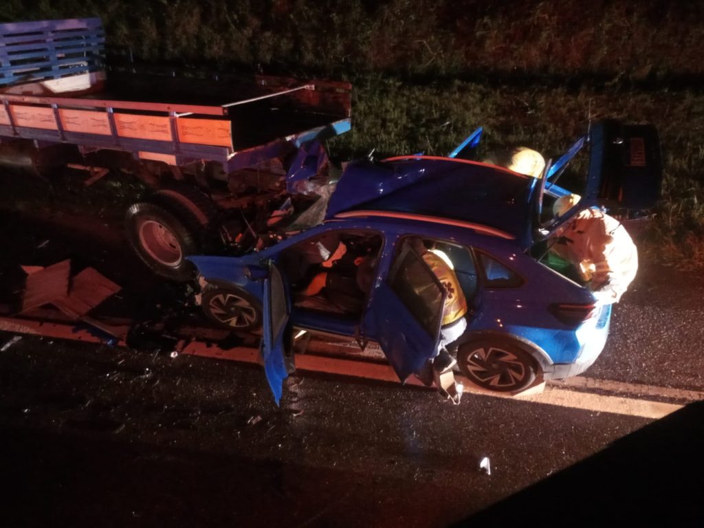 De acordo com os bombeiros, a colisão traseira envolveu um carro de passeio VW Nivus, com placas do Mercosul, e um caminhão Chevrolet com placas de Camboriú.