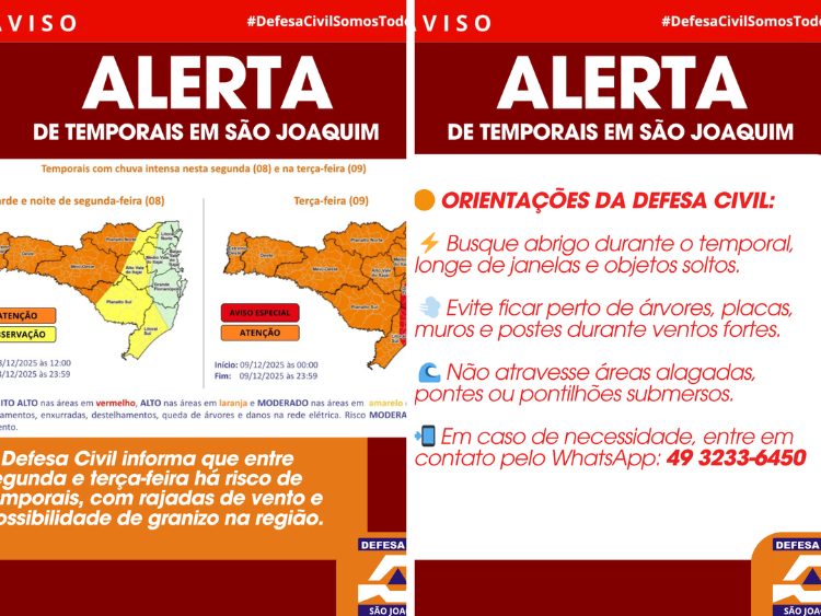 Em caso de necessidade, o atendimento da Defesa Civil de São Joaquim está disponível pelo WhatsApp (49) 3233-6450.
