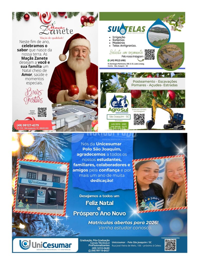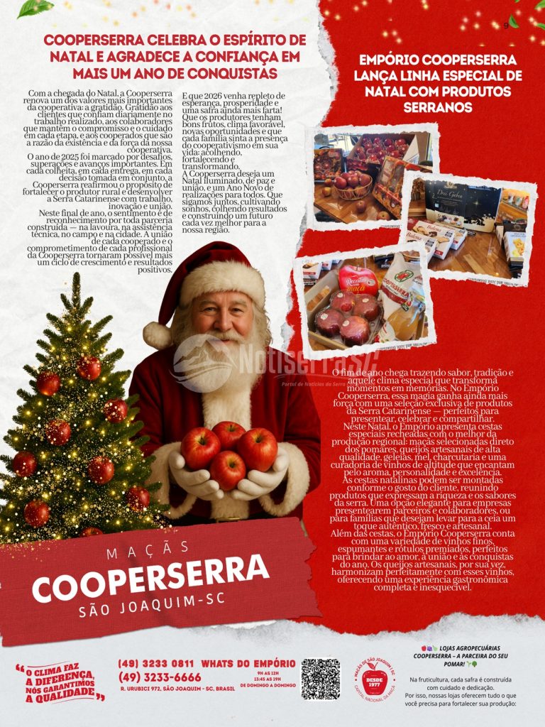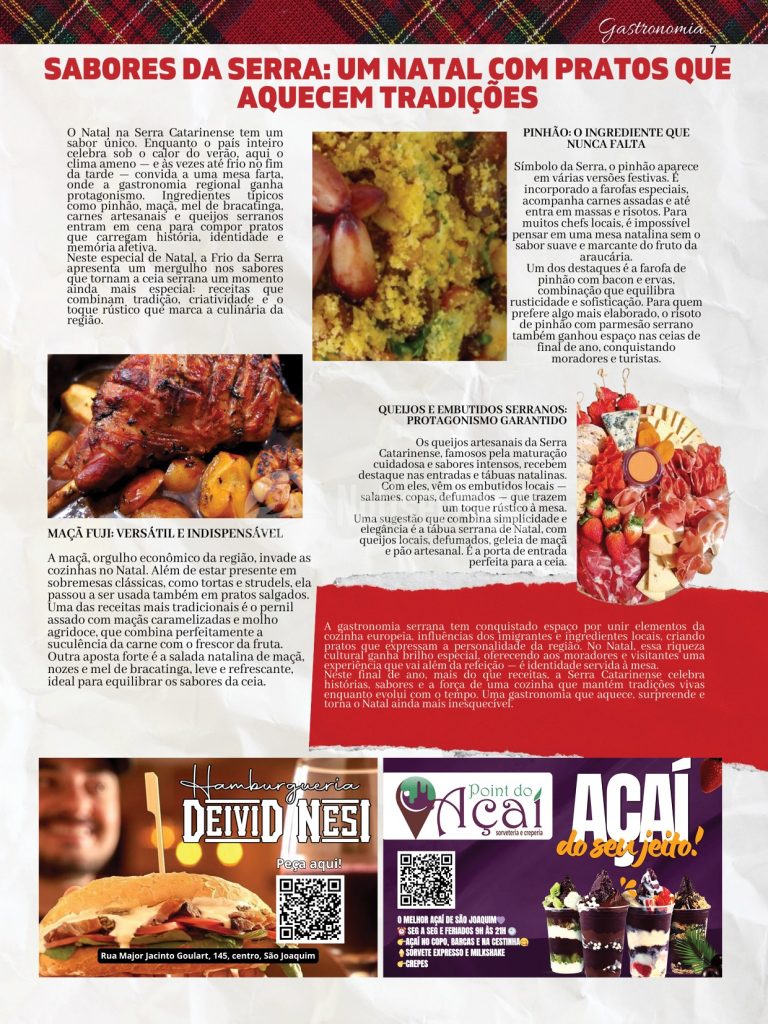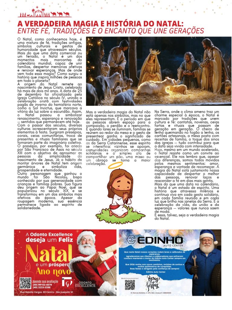 Nesta edição, os leitores encontram reportagens especiais que valorizam a região, destacam pessoas, histórias e tradições, além de temas que envolvem fé, cultura, gastronomia, economia e o cotidiano serrano. Um material pensado para informar, emocionar e celebrar o espírito natalino, mantendo o compromisso com o jornalismo regional de qualidade.