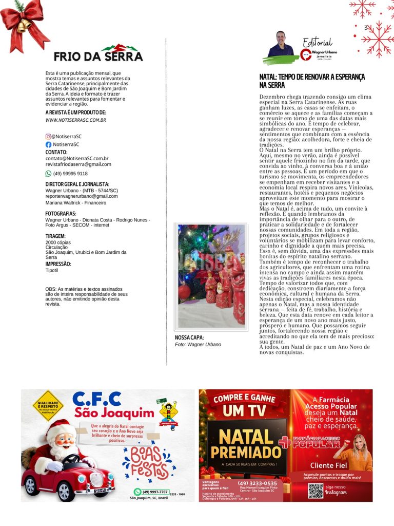 A Revista Frio da Serra já está circulando com a edição de dezembro, uma edição especial de Natal, número 48, preparada para marcar o encerramento de mais um ano com conteúdo relevante, informativo e alinhado à identidade da Serra Catarinense.