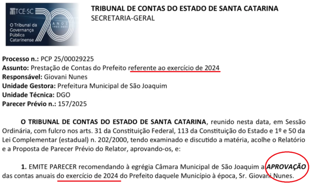 A recomendação favorável refere-se ao último ano da gestão de Giovani Nunes à frente da Prefeitura de São Joaquim, encerrando seu ciclo administrativo com oito pareceres consecutivos pela aprovação.