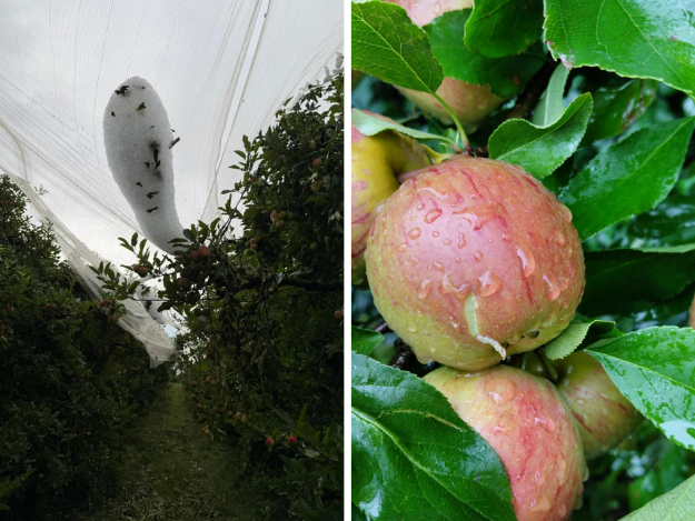 Em alguns pontos, o granizo se acumulou sobre as telas de proteção dos pomares, formando camadas de gelo. Na Fazenda Mantiqueira, as pedras de granizo atingiram diretamente as maçãs, deixando marcas visíveis nos frutos e provocando danos que podem resultar em prejuízos significativos aos produtores.