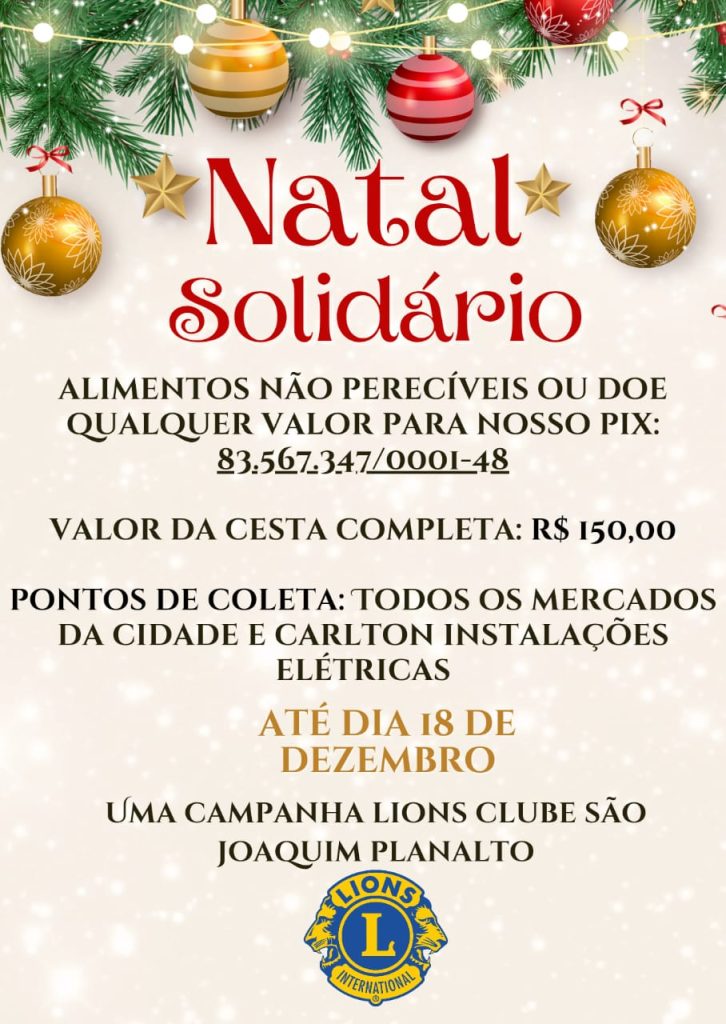 O Lions Clube São Joaquim Planalto iniciou mais uma edição da campanha “Natal Solidário”, ação tradicional que busca arrecadar cestas básicas para famílias em situação de vulnerabilidade no município. A iniciativa, que se repete anualmente, tem o objetivo de levar dignidade e esperança a quem mais precisa durante o período natalino.