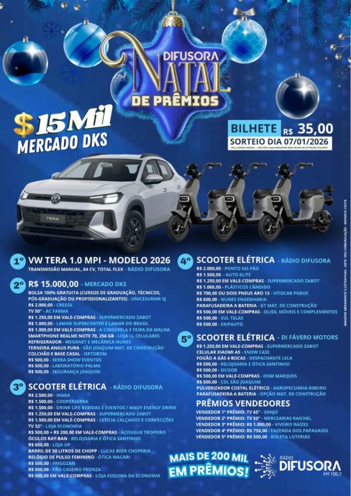 “Preparamos uma ação especial para prestigiar nossos ouvintes e o comércio local. O grande destaque é o Volkswagen TERA 0 km, além de R$ 15 mil em dinheiro e três scooters elétricas, junto com mais prêmios em cada categoria”, destacaram os organizadores.