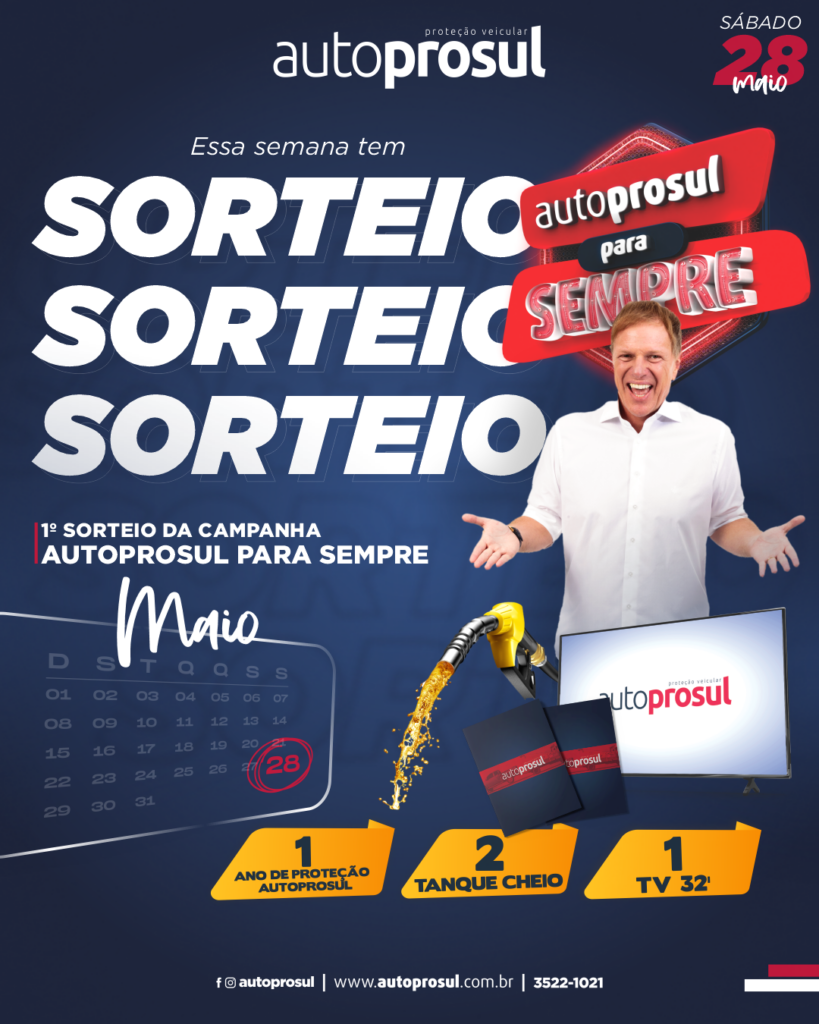 Neste sábado, dia 28 de maio, ocorrerá o primeiro grande sorteio da campanha “Autoprosul para Sempre”, da maior associação veicular do sul de Santa Catarina e a que mais cresce no Estado. Este sorteio será o primeiro dos dez que serão realizados pela Autoprosul e que se estenderá até fevereiro, onde será realizado o último grande sorteio com o maior prêmio da campanha, um Renault Kwid.