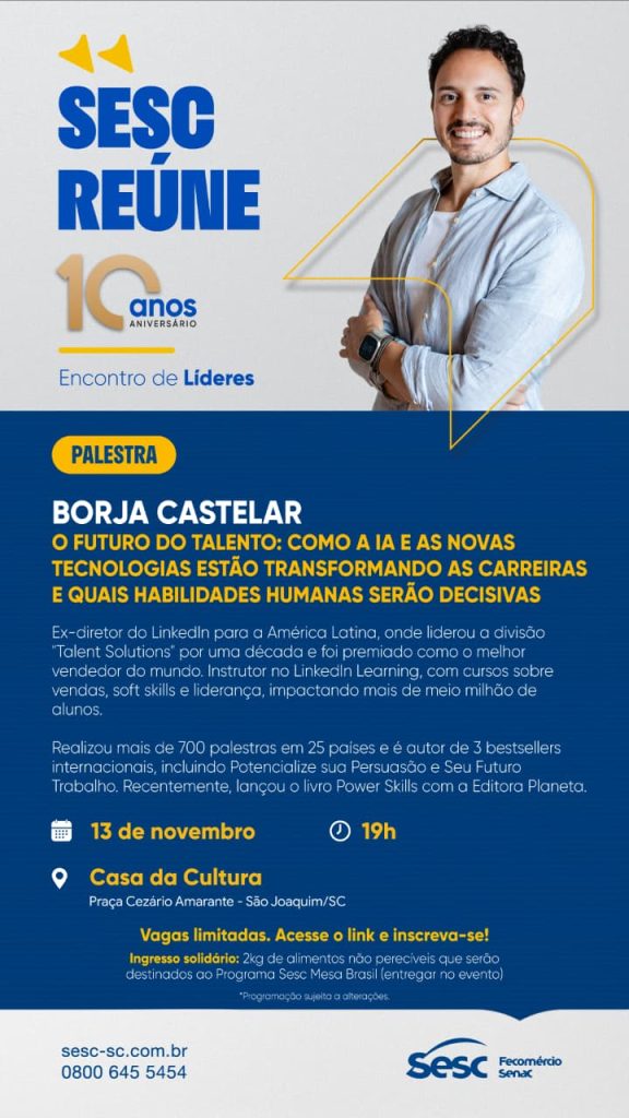 No dia 13 de novembro de 2025, às 19h, a Casa da Cultura de São Joaquim será palco de um evento imperdível para empresários, líderes, gestores e profissionais de RH. O renomado palestrante e treinador espanhol Borja Castelar apresentará a conferência “O Futuro do Talento: Como a IA e as novas tecnologias estão transformando as carreiras e quais habilidades humanas serão decisivas.”