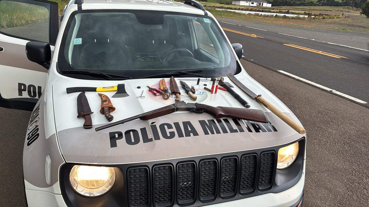 Durante a revista veicular, os policiais localizaram uma espingarda calibre 32, munições intactas e materiais utilizados para a confecção de munição, todos ocultos no interior do automóvel. Também foram apreendidos diversos objetos sem comprovação de origem, entre eles armas brancas de grande porte, ferramentas, um aparelho celular e uma caixa de som.