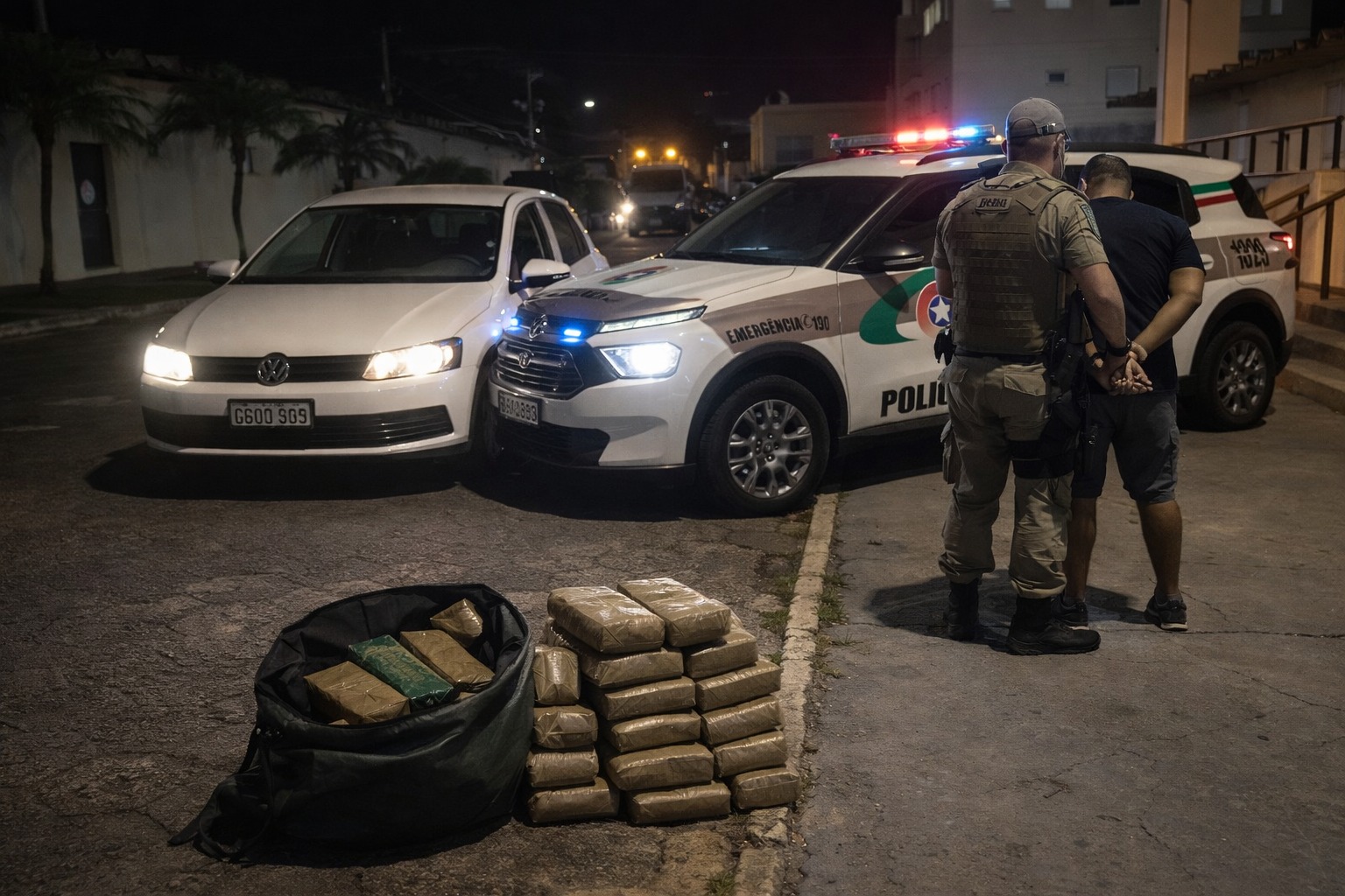 O automóvel foi abordado no bairro Guarujá. Durante a busca veicular, os policiais localizaram uma bolsa contendo 25 tabletes de substância semelhante à maconha, que, após pesagem, totalizou aproximadamente 14,865 quilos da droga.
