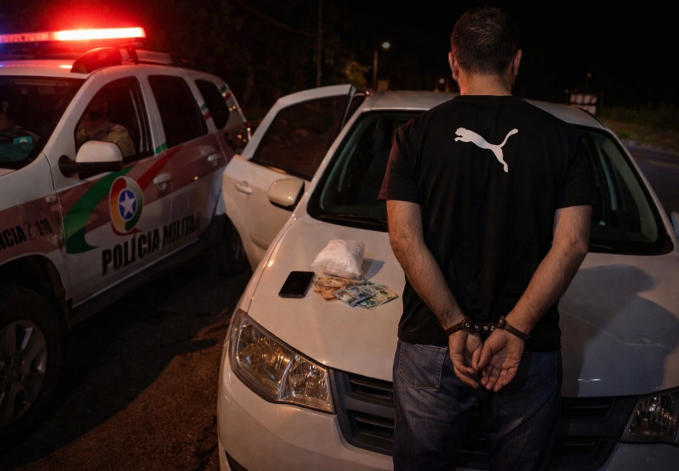 Diante dos fatos, o condutor recebeu voz de prisão em flagrante, foi informado de seus direitos constitucionais e encaminhado à Delegacia de Polícia Civil de São Joaquim para os procedimentos legais. O veículo, um aparelho celular e uma quantia em dinheiro também foram apreendidos e ficarão à disposição da investigação.