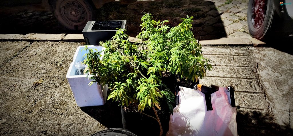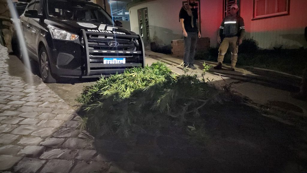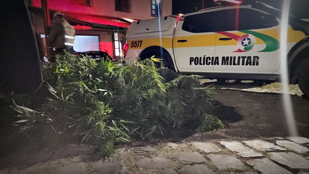 Com o apoio de equipes da Polícia Militar, os agentes realizaram buscas nas proximidades. Durante as diligências, os policiais localizaram, em um terreno residencial, uma planta com cerca de dois metros de altura, com características semelhantes à maconha.