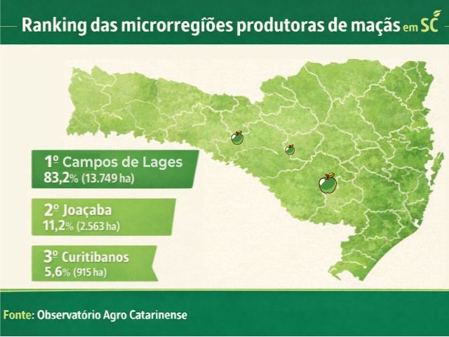 A Epagri/Cepa indica que as regiões de Campos de Lages, Joaçaba e Curitibanos concentram a produção de maçã em Santa Catarina. A microrregião dos Campos de Lages responde por 83,2% da produção esperada, seguida por Joaçaba (11,2%) e Curitibanos (5,6%). Os principais municípios produtores somam 95,33% da área em produção, com destaque para São Joaquim (58,58%), Fraiburgo (10,87%), Bom Jardim da Serra (10,07%), Urubici (4,83%), Urupema (4,30%), Monte Carlo (3,78%) e Painel (2,90%).