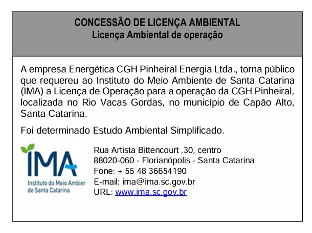Home Editais Requerimento CONCESSÃO DE LICENÇA AMBIENTAL Licença Ambiental de operação – ... Editais Requerimento CONCESSÃO DE LICENÇA AMBIENTAL Licença Ambiental de operação – Energética CGH Pinheiral Energia Ltda FacebookTwitterPinterestWhatsApp