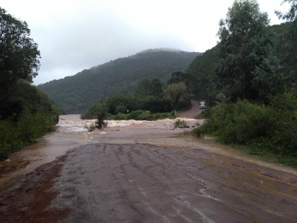 São Joaquim, na serra de Santa Catarina, seguiu registrando fortes chuvas ao longo desta segunda-feira (2) e alagou pomares no interior da cidade e encobriu pontes.