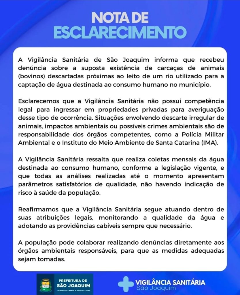 A Vigilância Sanitária de São Joaquim informou que recebeu uma denúncia sobre a suposta existência de carcaças de animais bovinos descartadas nas proximidades do leito de um rio utilizado para a captação de água destinada ao consumo humano no município.