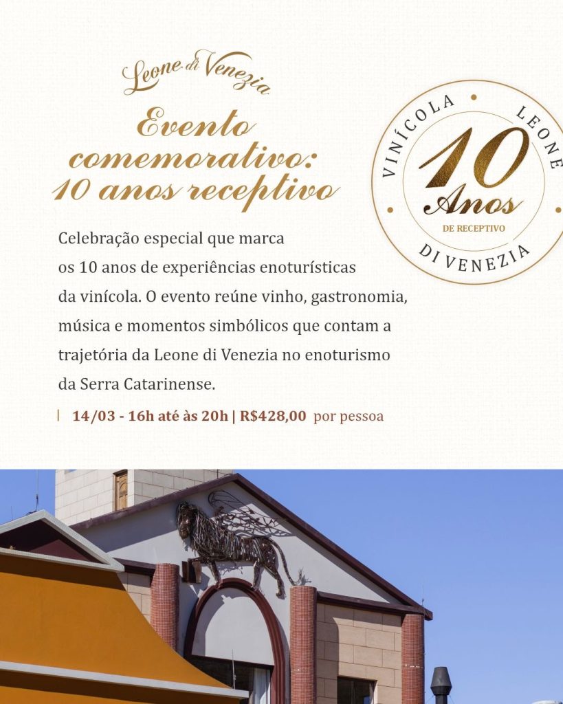 Em 2026, a Vinícola Leone di Venezia, em São Joaquim, vive um momento ainda mais significativo. Além de celebrar a vindima, a vinícola também comemora 10 anos de receptivo, uma década dedicada a acolher visitantes, compartilhar experiências e brindar momentos especiais com quem chega para conhecer os vinhos de altitude da Serra Catarinense.